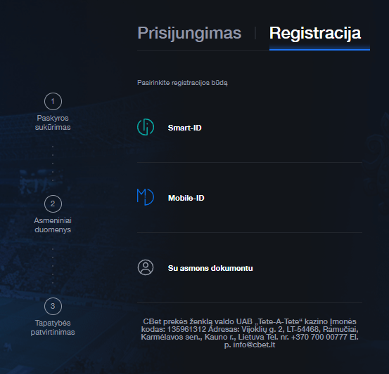 Pasirinkite registracijos būdą: Smart-ID, Mobile-ID arba su asmens tapatybės dokumentu
